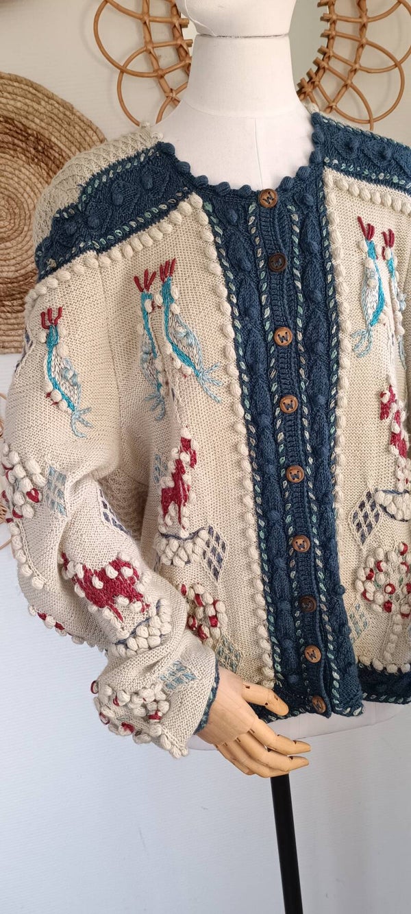 Every Wolkenstricker is fully handmade, unique & one of a kind. This model has a beautiful 3D popcorn effect with embroidered horses and birds. And of course it also has the traditional W buttons ✨.