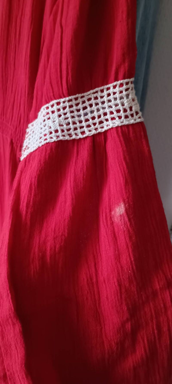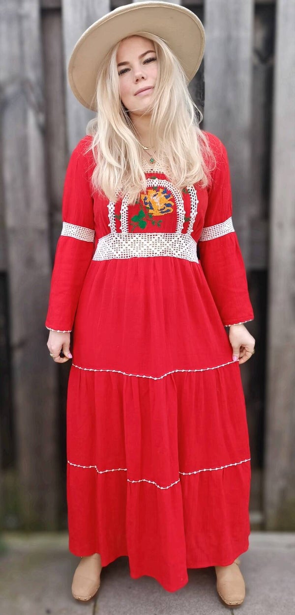Beautiful vintage 1970s bright red gauze dress with embroidered bust and lace details ☀️