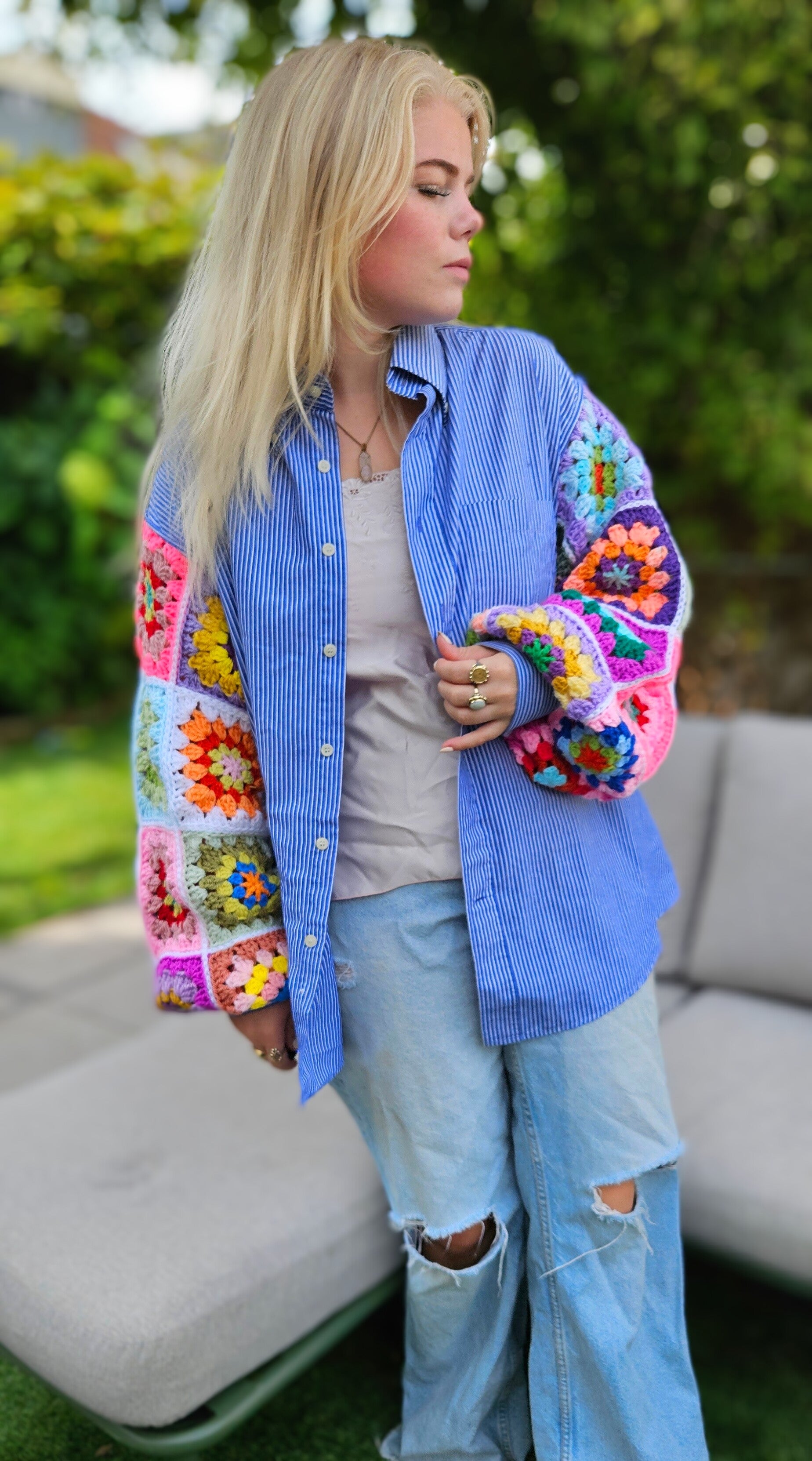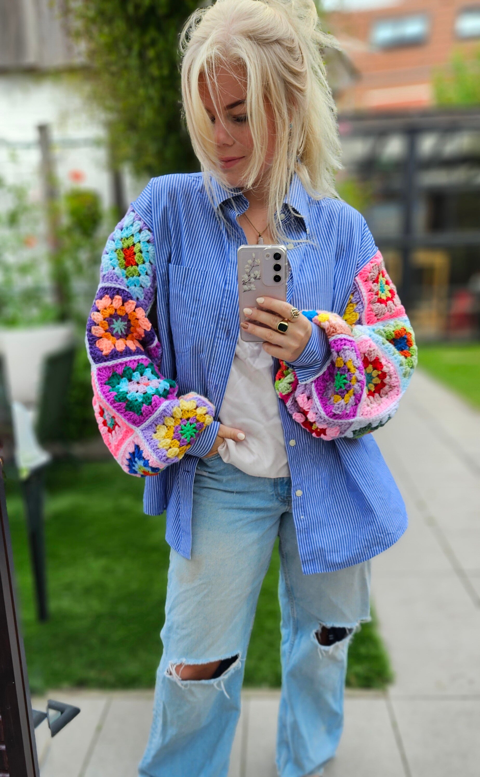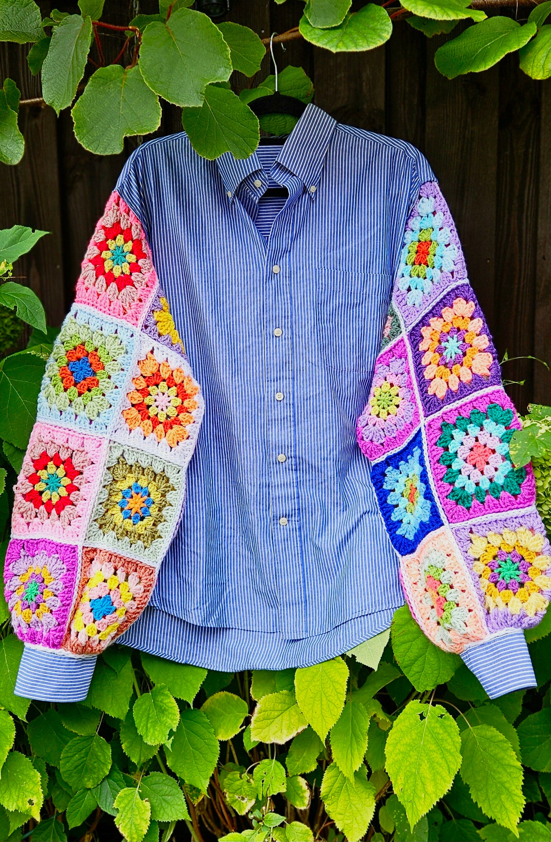 Upcycled vintage cotton blouse with handmade granny square crochet sleeves (by me) ❤️