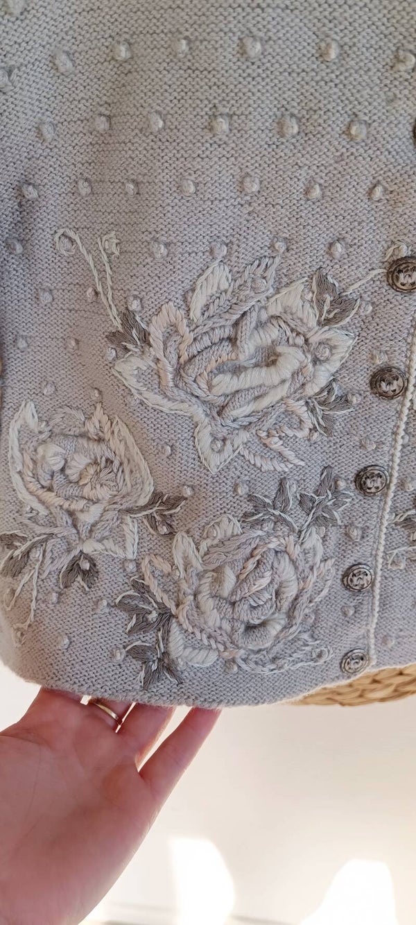 This model is very classic with soft pastel embroidery 💖. The front of the cardigan is dubbele knitted, this to secure the embroidery and make the cardigan last a lifetime. Has removable shoulder pads. Traditional W buttons (metal)✨.