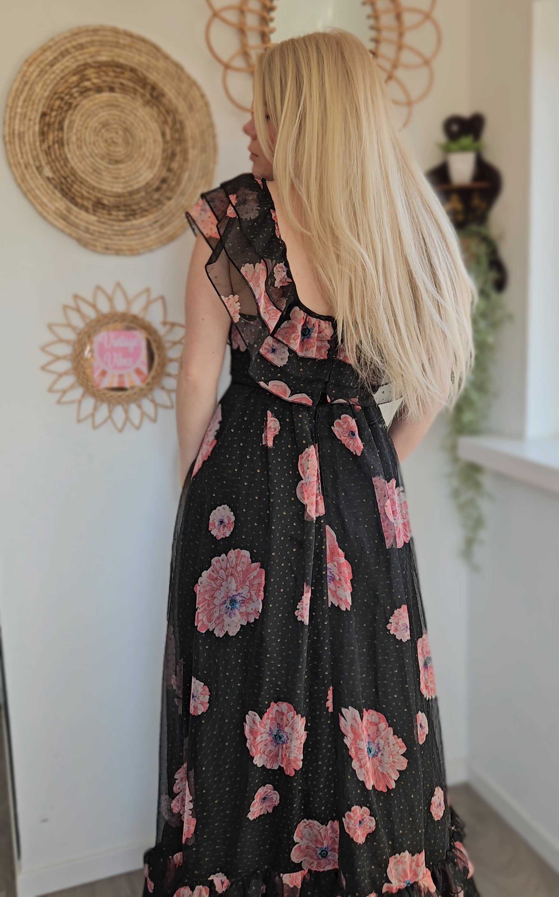 Beautiful vintage 70s maxi of shoulder dress by Vera Mont 🩷 the dress is lined. Zipper at be back for easy access. You can wear it off our on the shoulders