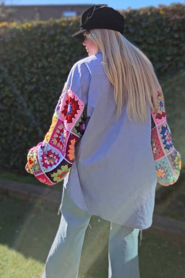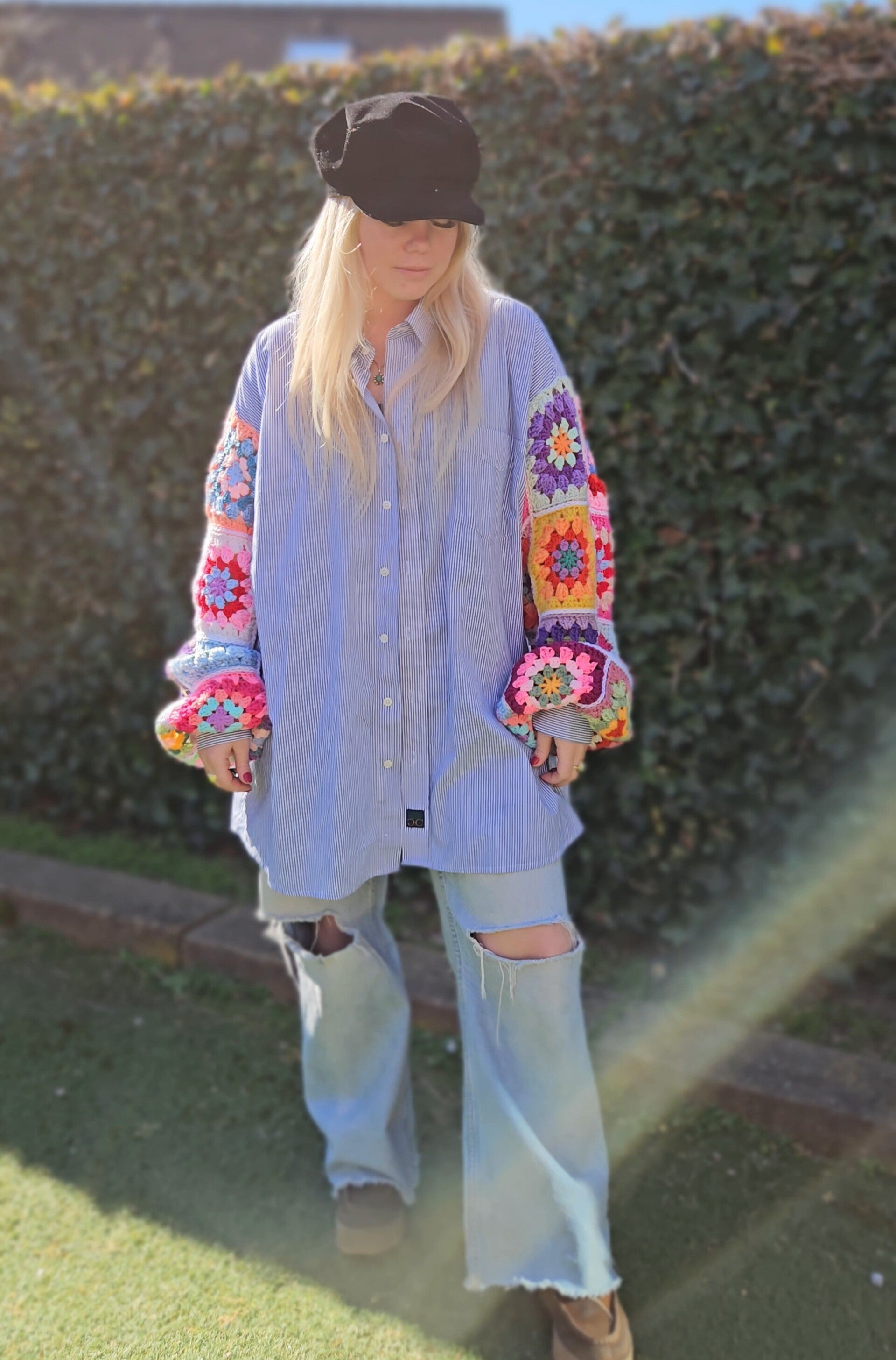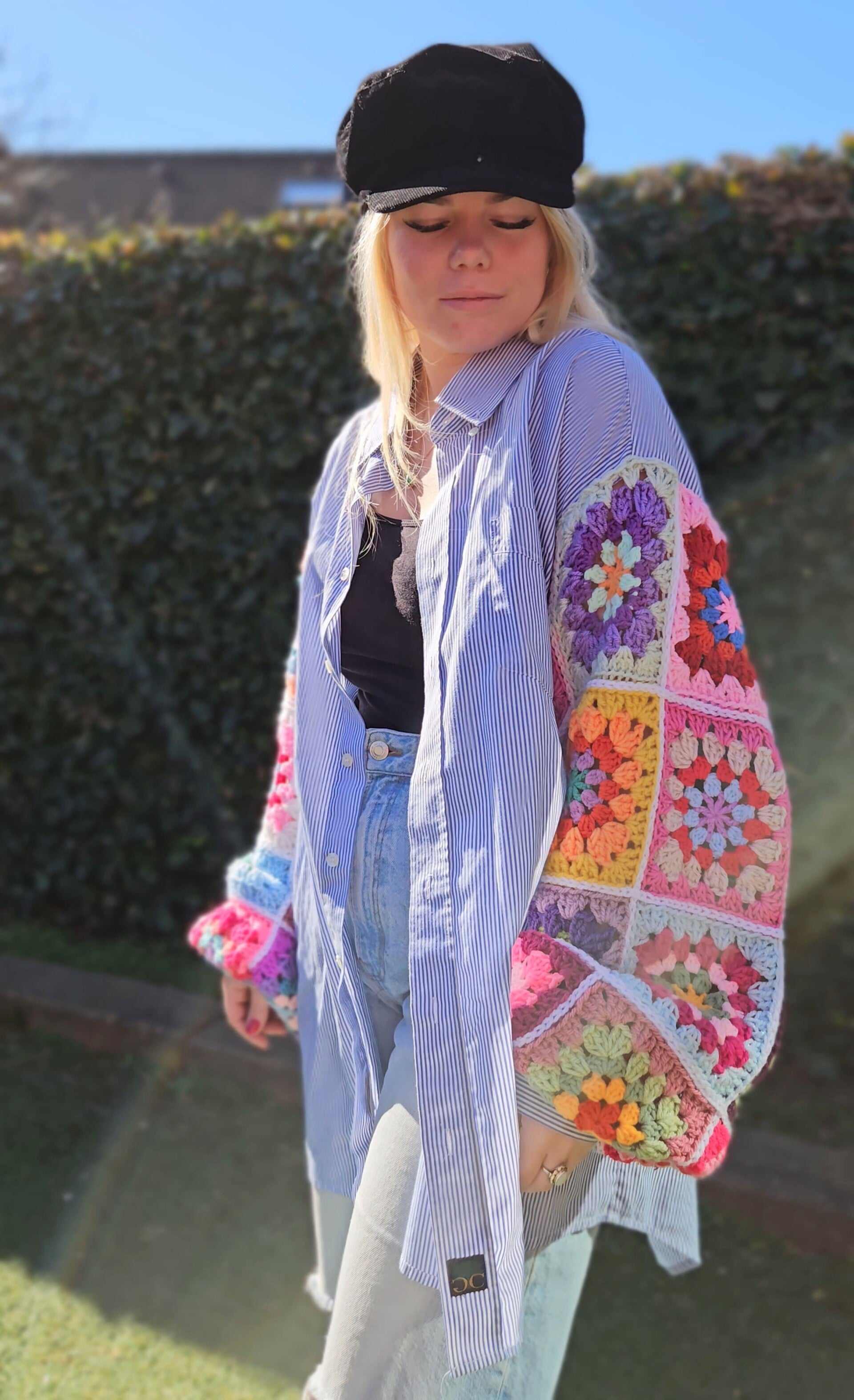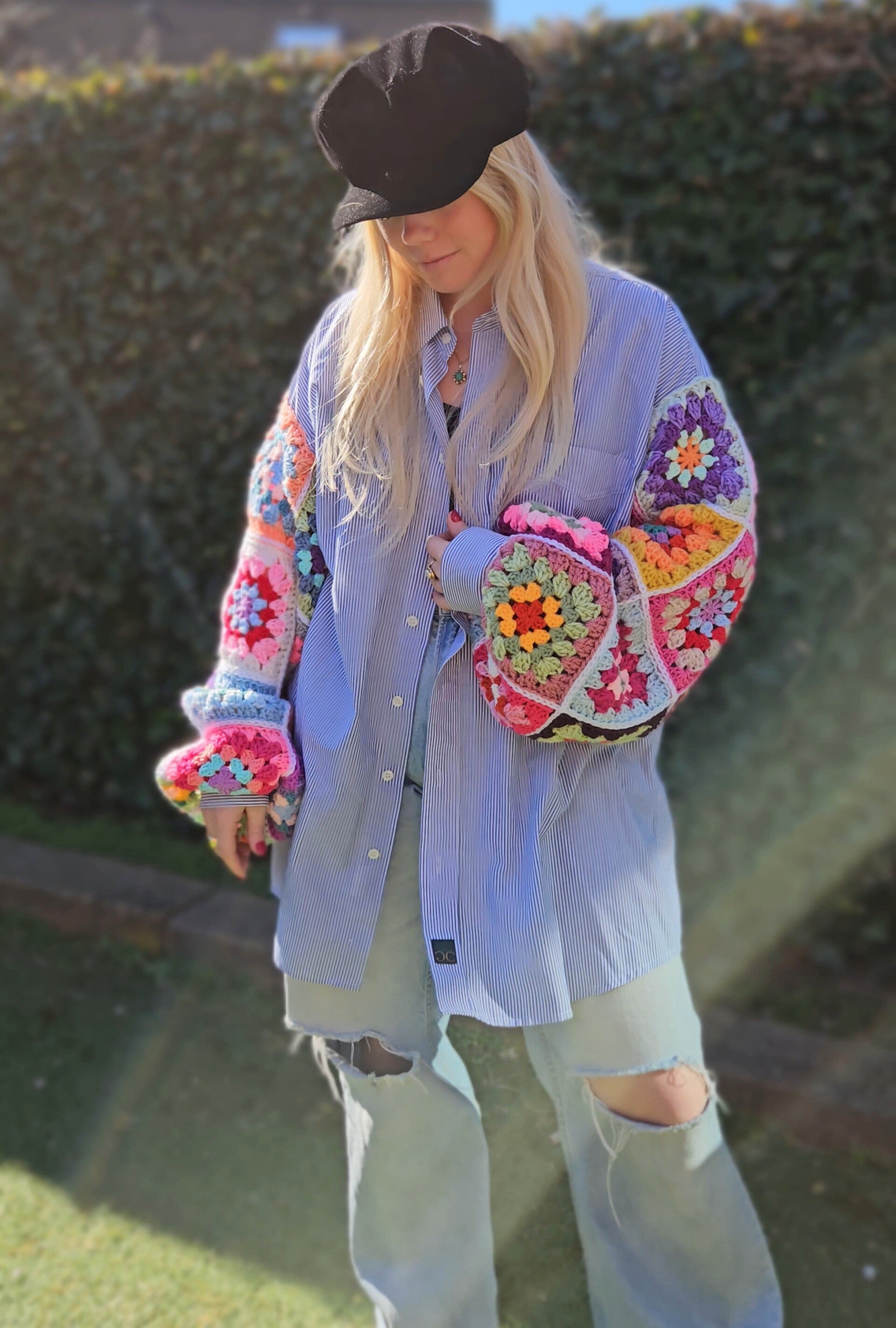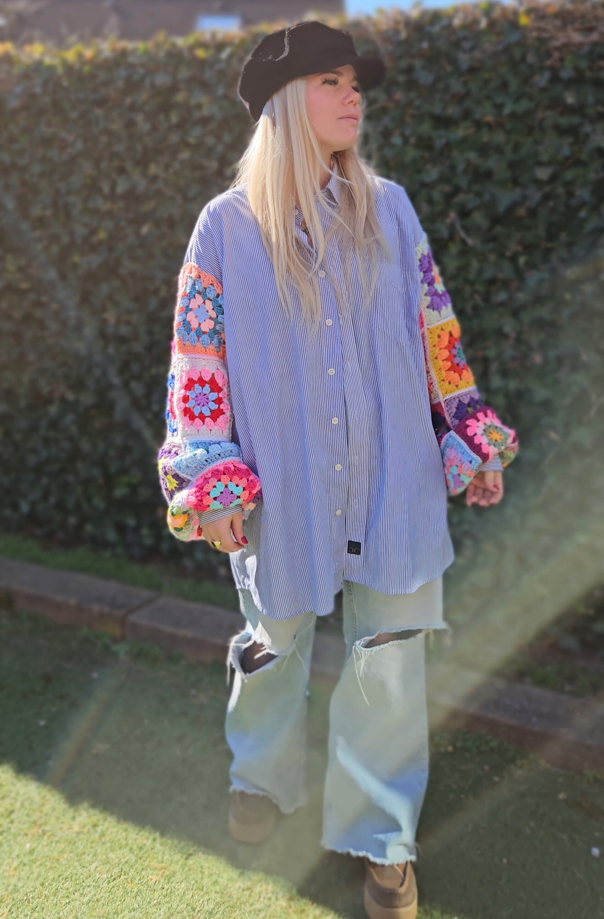 Upcycled cotton blouse with handmade granny square crochet sleeves (by me) ❤️