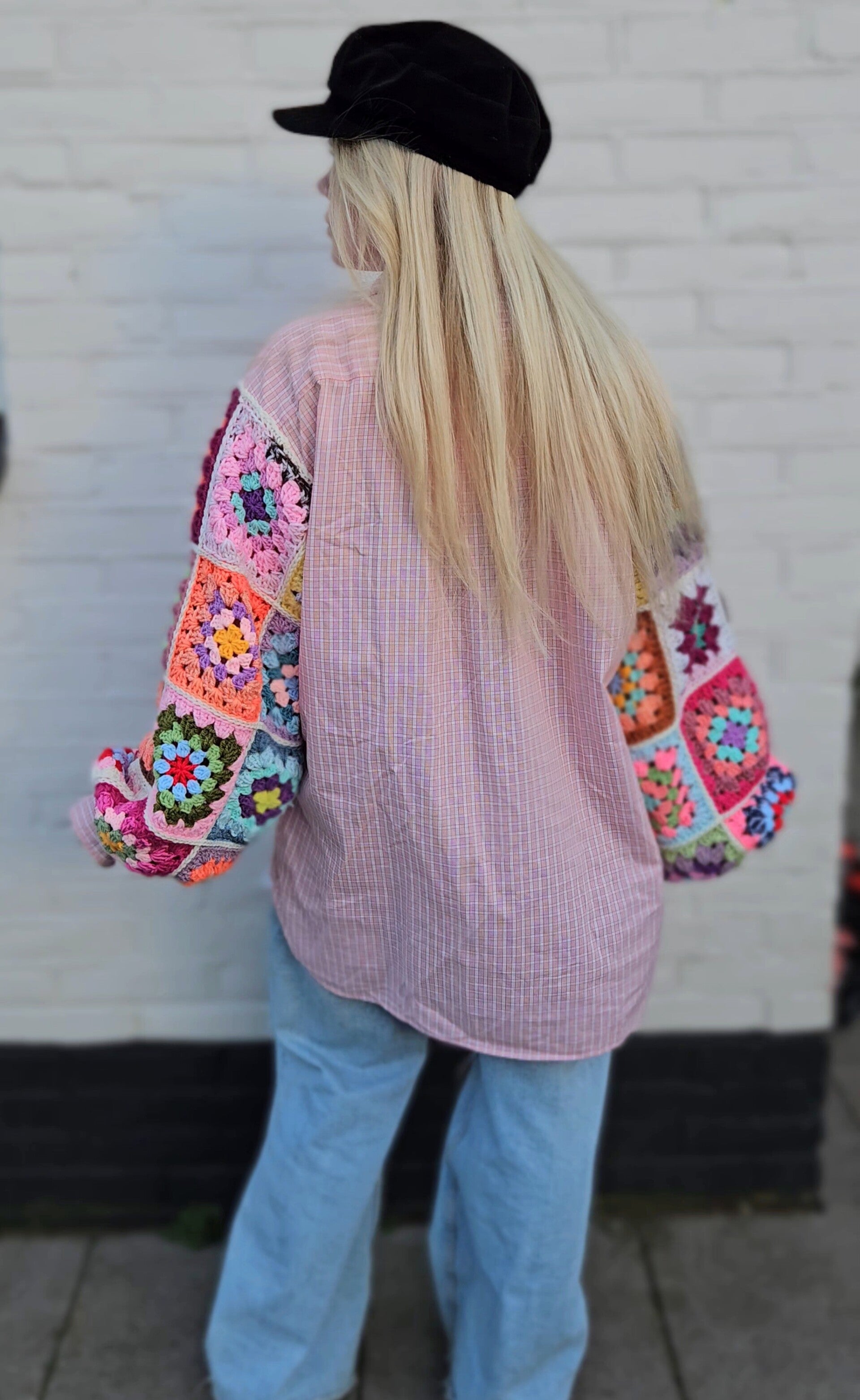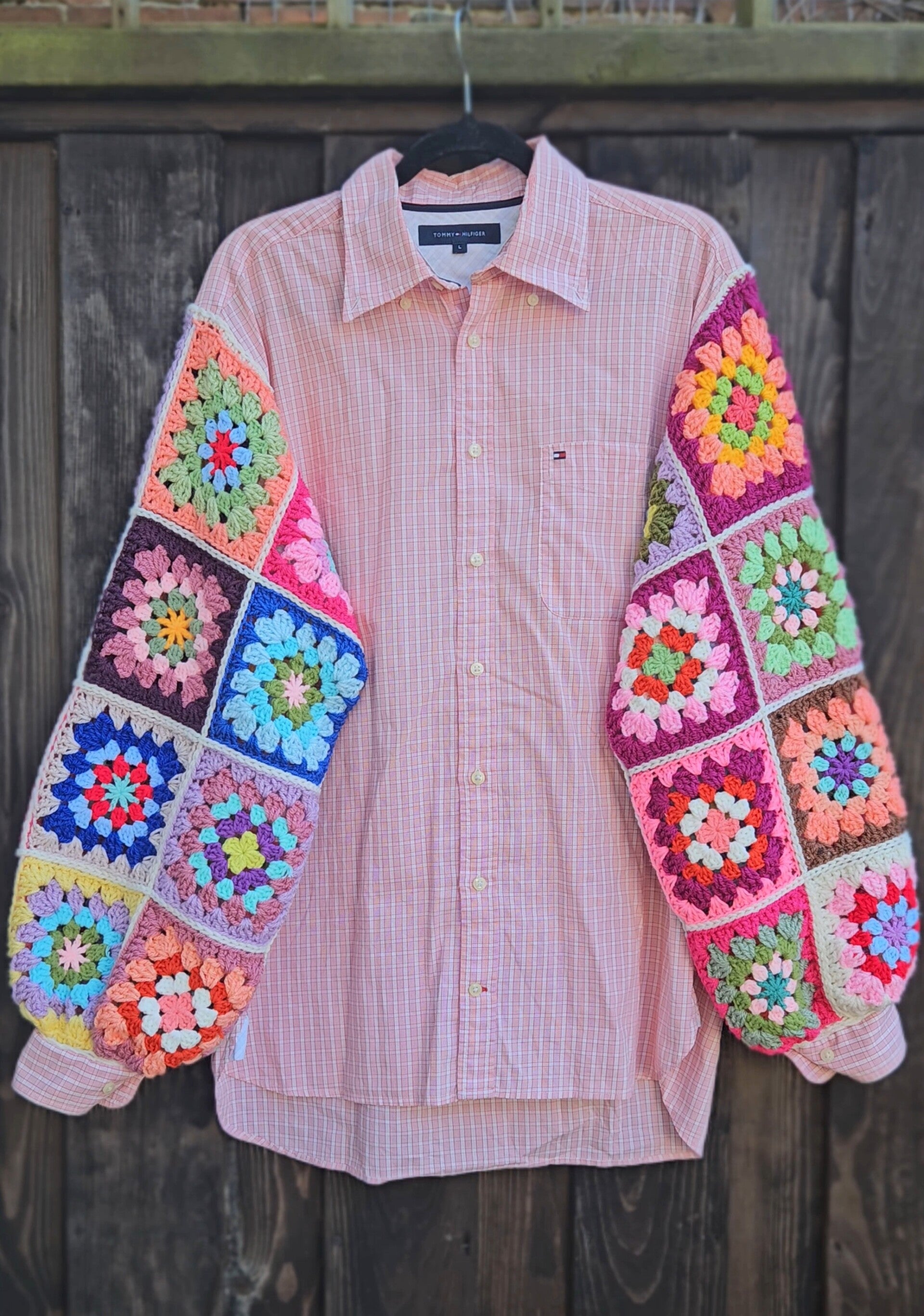 Upcycled Tommy Hilfiger cotton blouse with handmade (by me) granny square crochet sleeves ❤️