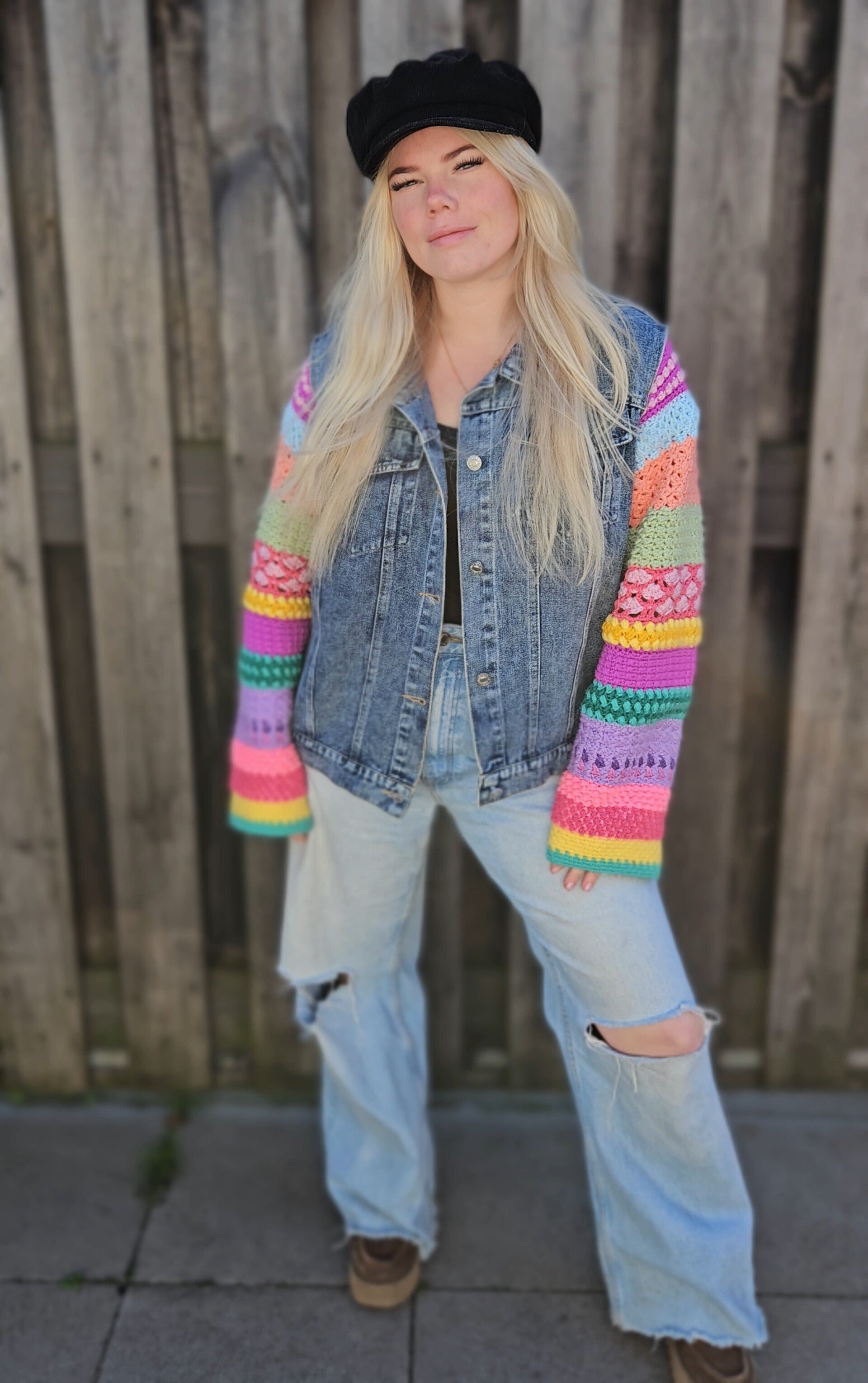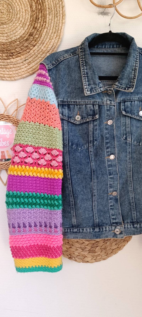 Upcycled denim jacket with handmade (by my mom) crochet sleeves ❤️