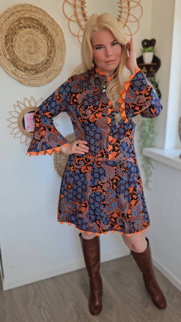 Eye-catching vintage 70s dress featuring a bold psychedelic floral print in vibrant orange and blue tones. Styled with flared sleeves, rickrack trim, and a flattering A-line silhouette , perfect for a true retro statement look.
