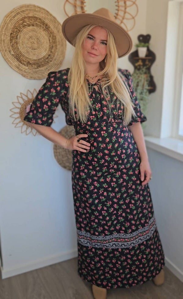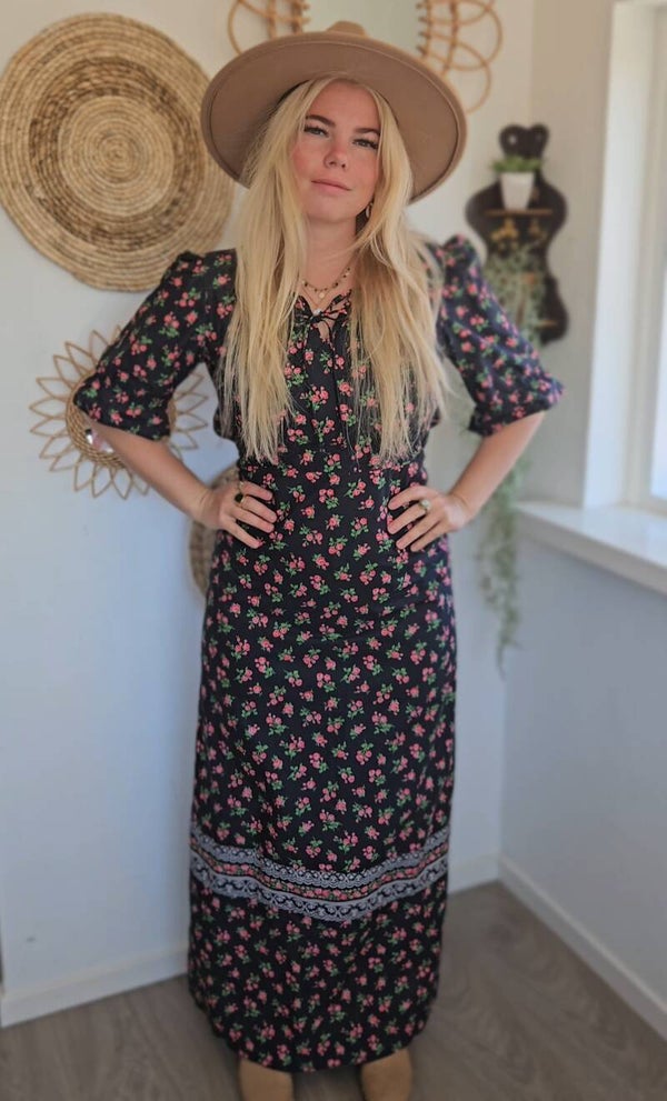 Step into vintage elegance with this stunning 1970s floral maxi dress. Featuring a black base adorned with delicate pink and green floral prints & puff sleeves. This dress brings romantic prairie vibes.