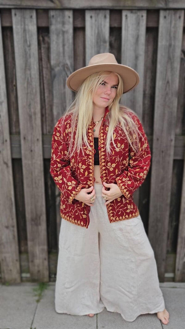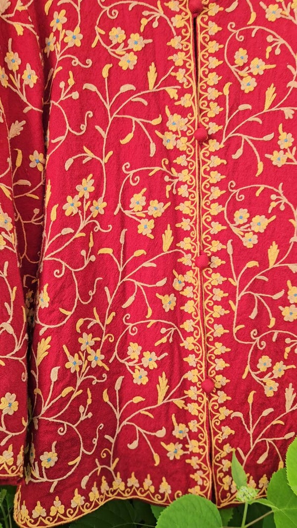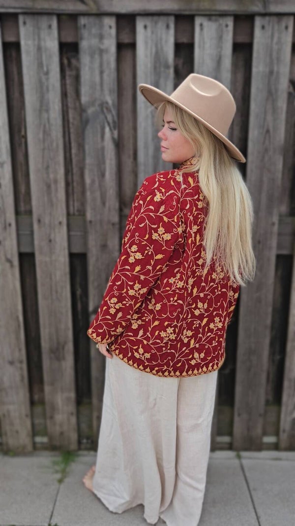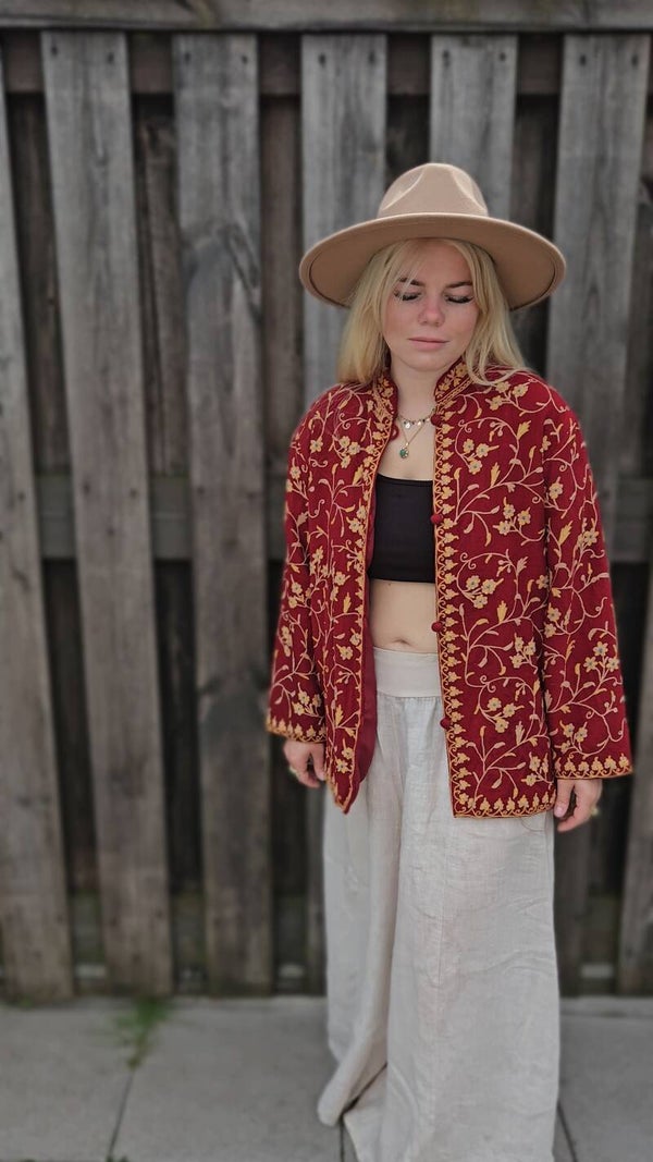 Add a touch of bohemian charm with this 1970s embroidered jacket from India. Crafted with intricate detailing in derp red & gold tones, this unique piece showcases traditional craftsmanship and vintage flair. Perfect as a statement layer for any outfit.