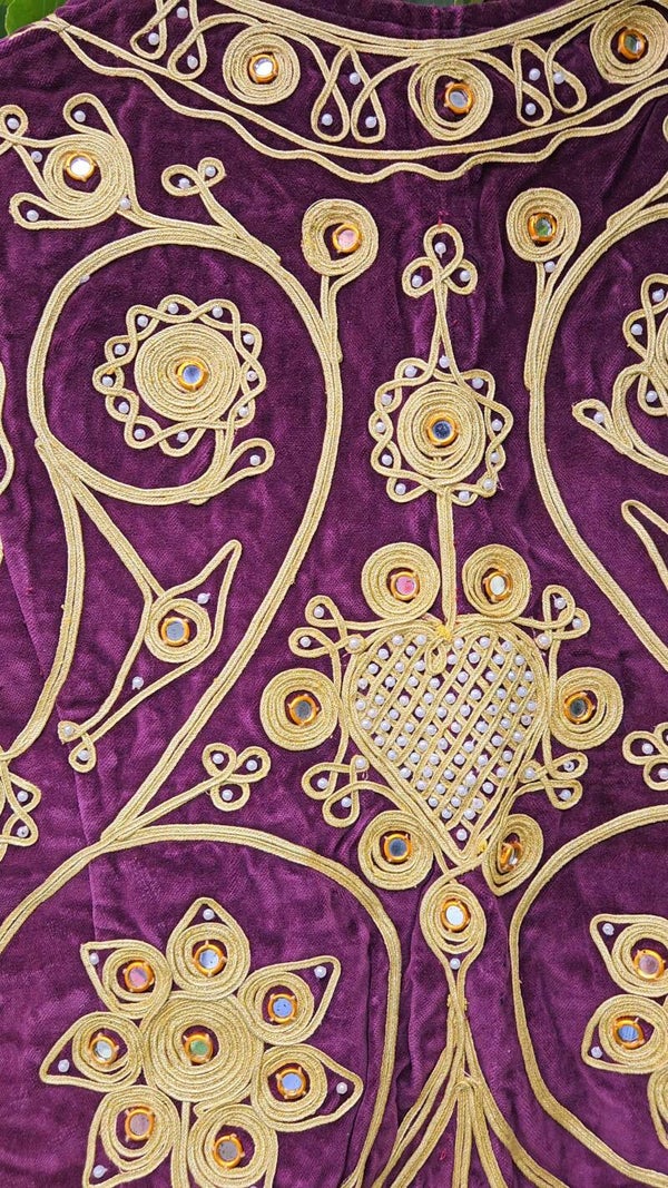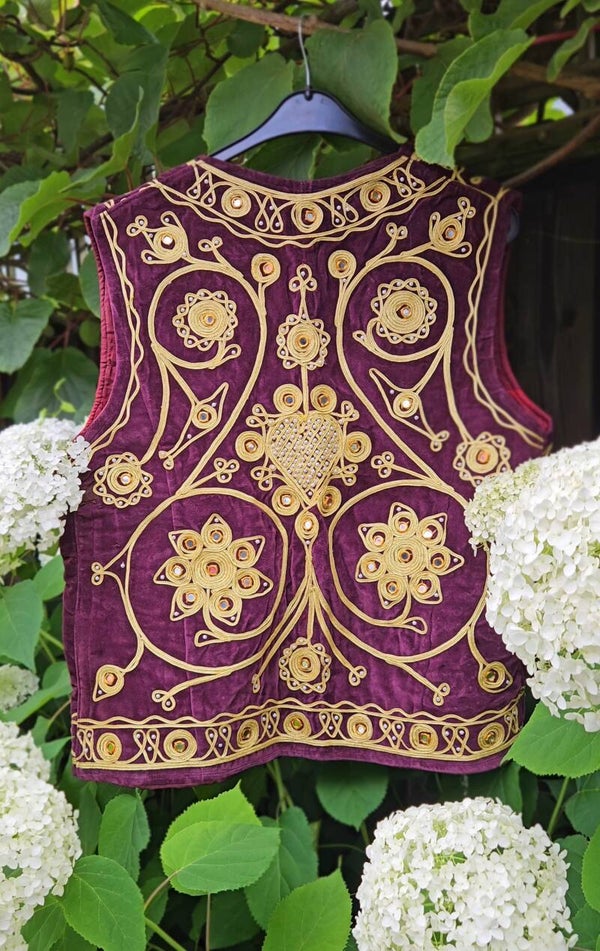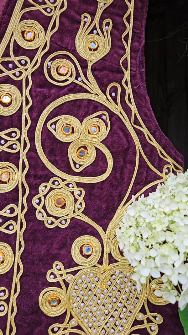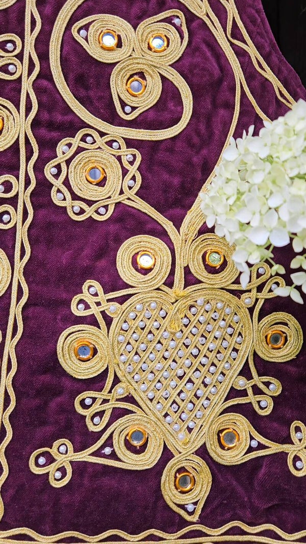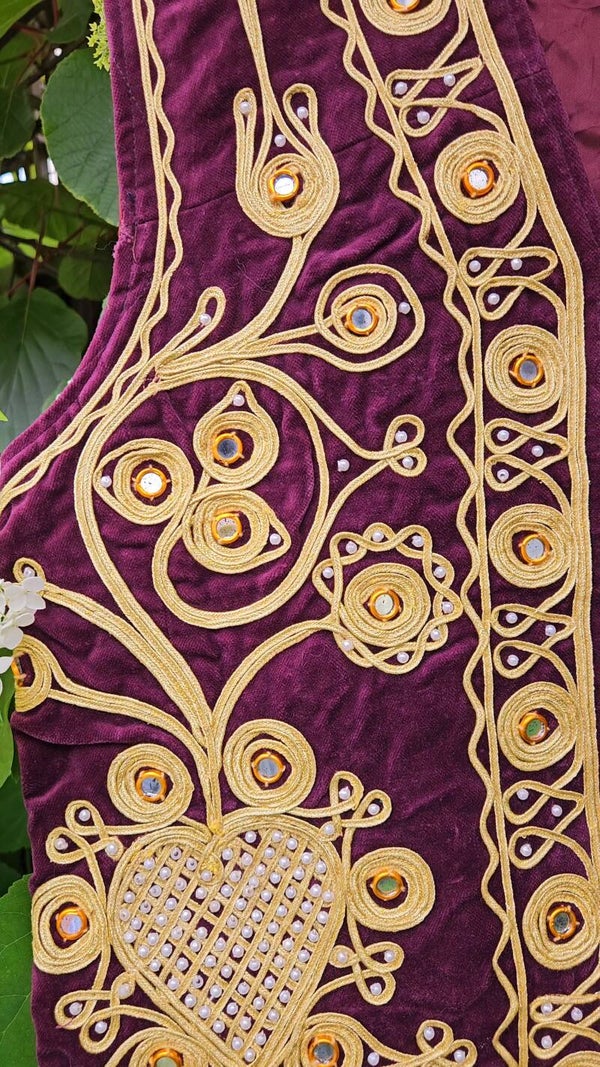 Striking 1970s Afghan vest crafted from rich burgundy velvet, adorned with traditional golden embroidery, intricate mirror work and pearls. This handcrafted piece features symmetrical heart and floral motifs, with shimmering details that catch the light beautifully. A true vintage treasure.
