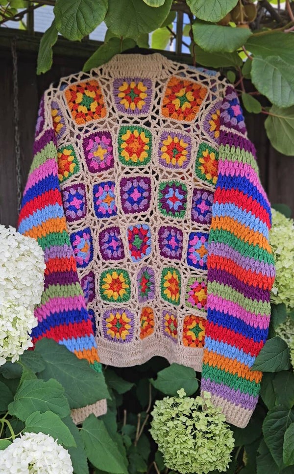 Bursting with color and charm, this handmade wool cardigan from Nepal features classic granny square crochet patterns in vibrant hues. Each square is carefully crafted and joined with bold or neutral tones, making every piece unique.