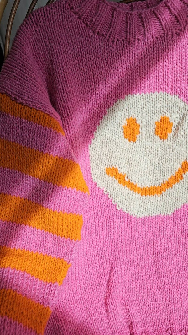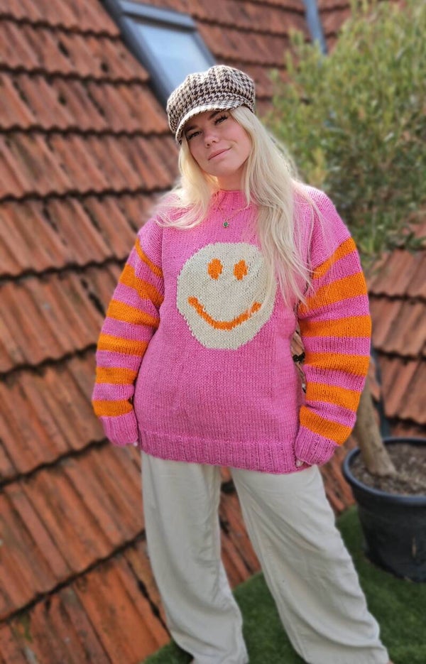 Feel the warm hug of sustainability in this chunky hand knitted smiley motif jumper. The universally recognised symbol sits front and centre on the main body of pink yarn. A cheerful design benefits from a colour scheme of pink and orange striped sleeves, ribbed edge details and a cosy, high neckline.