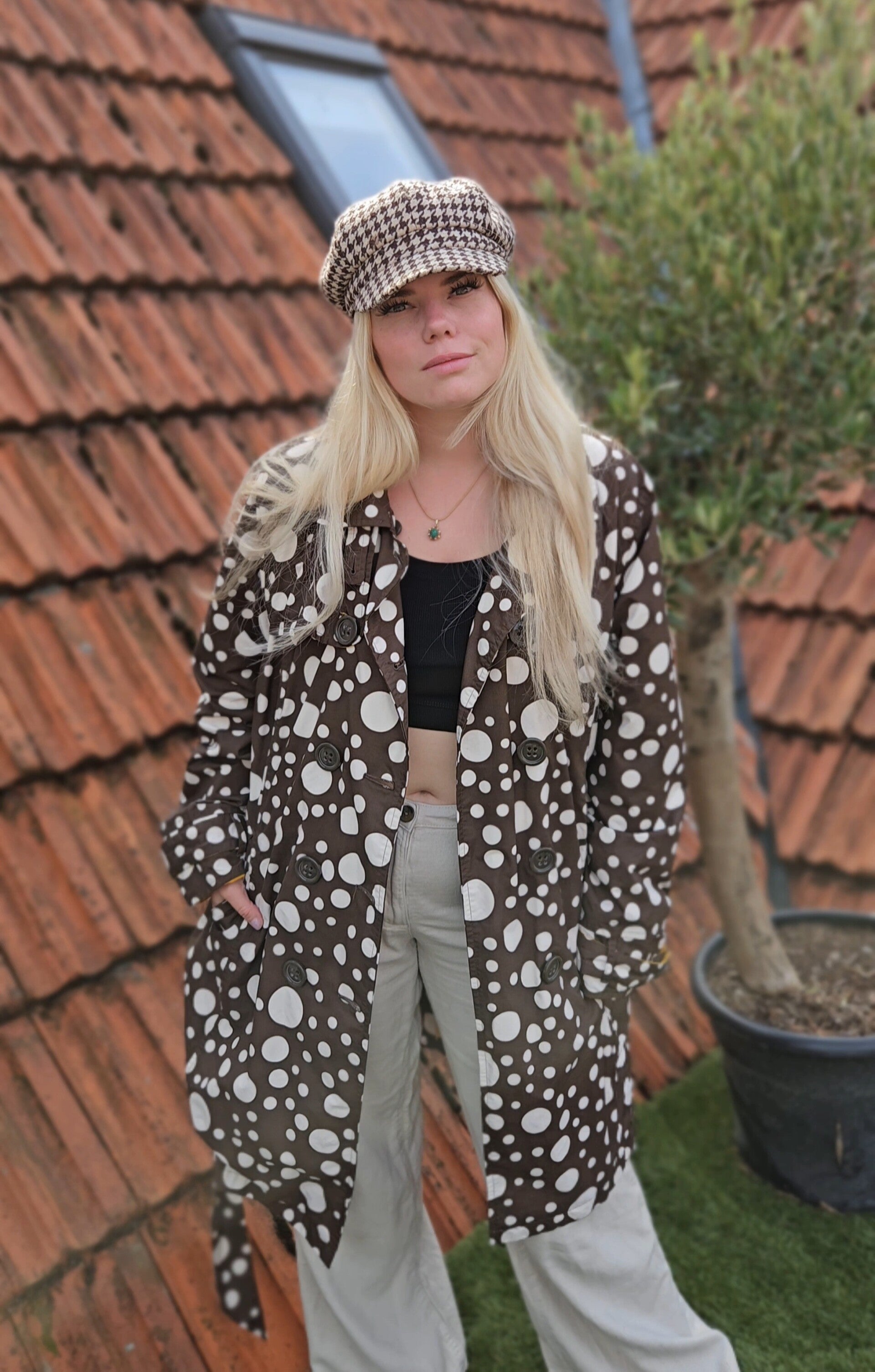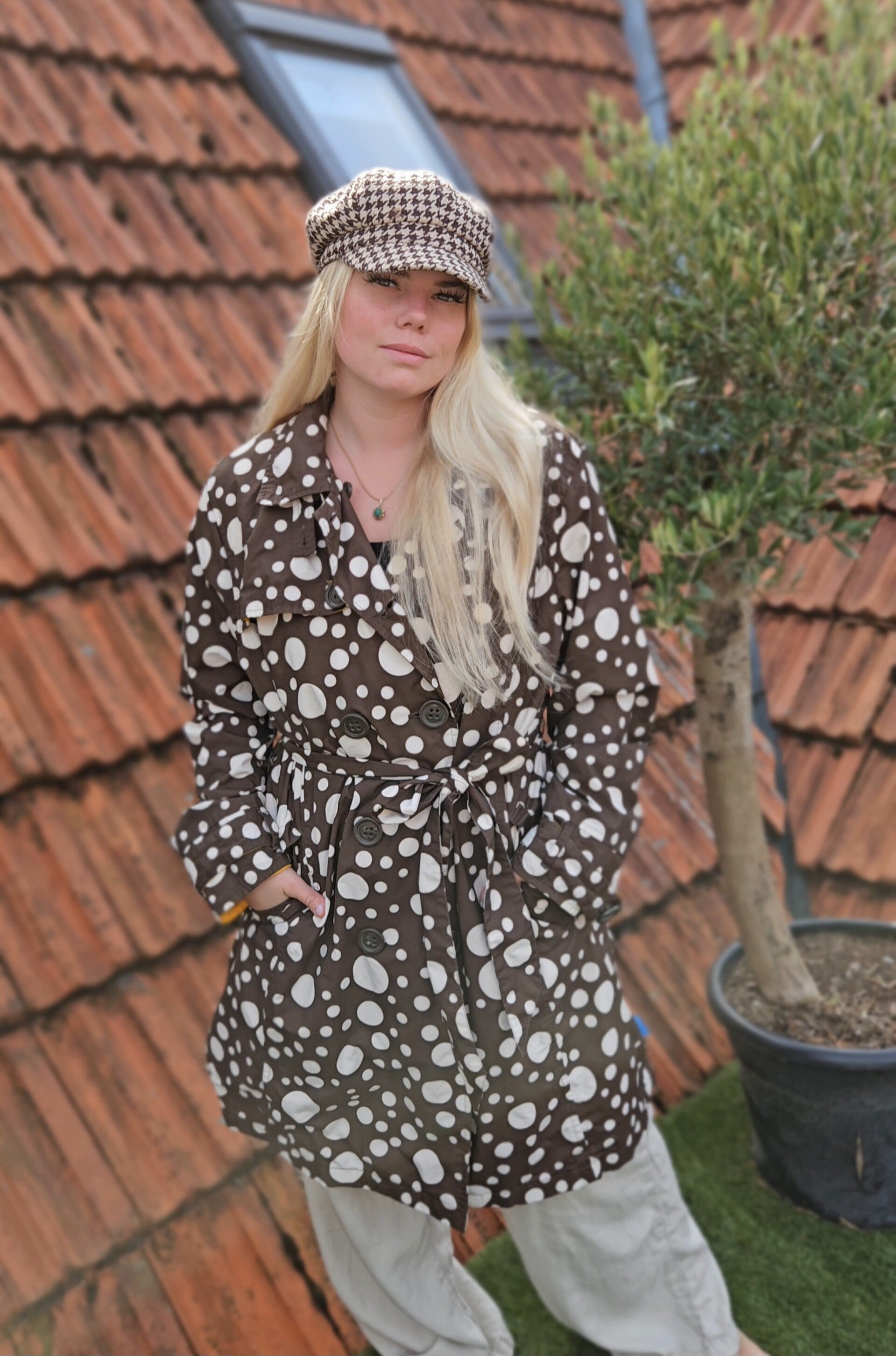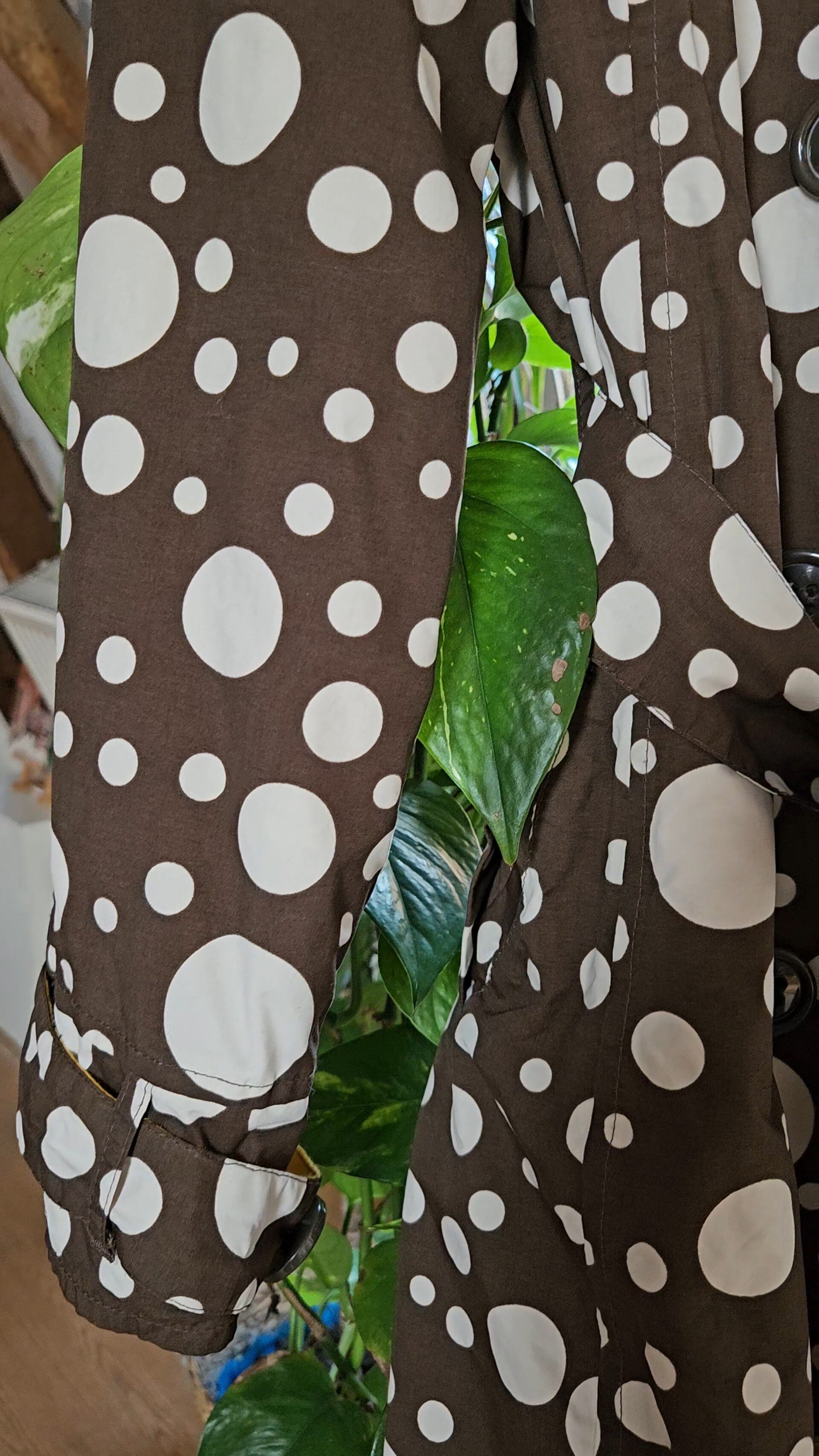 Beautiful polkadot rain/trenchcoat by the brand Happy Rainy Days 🤎