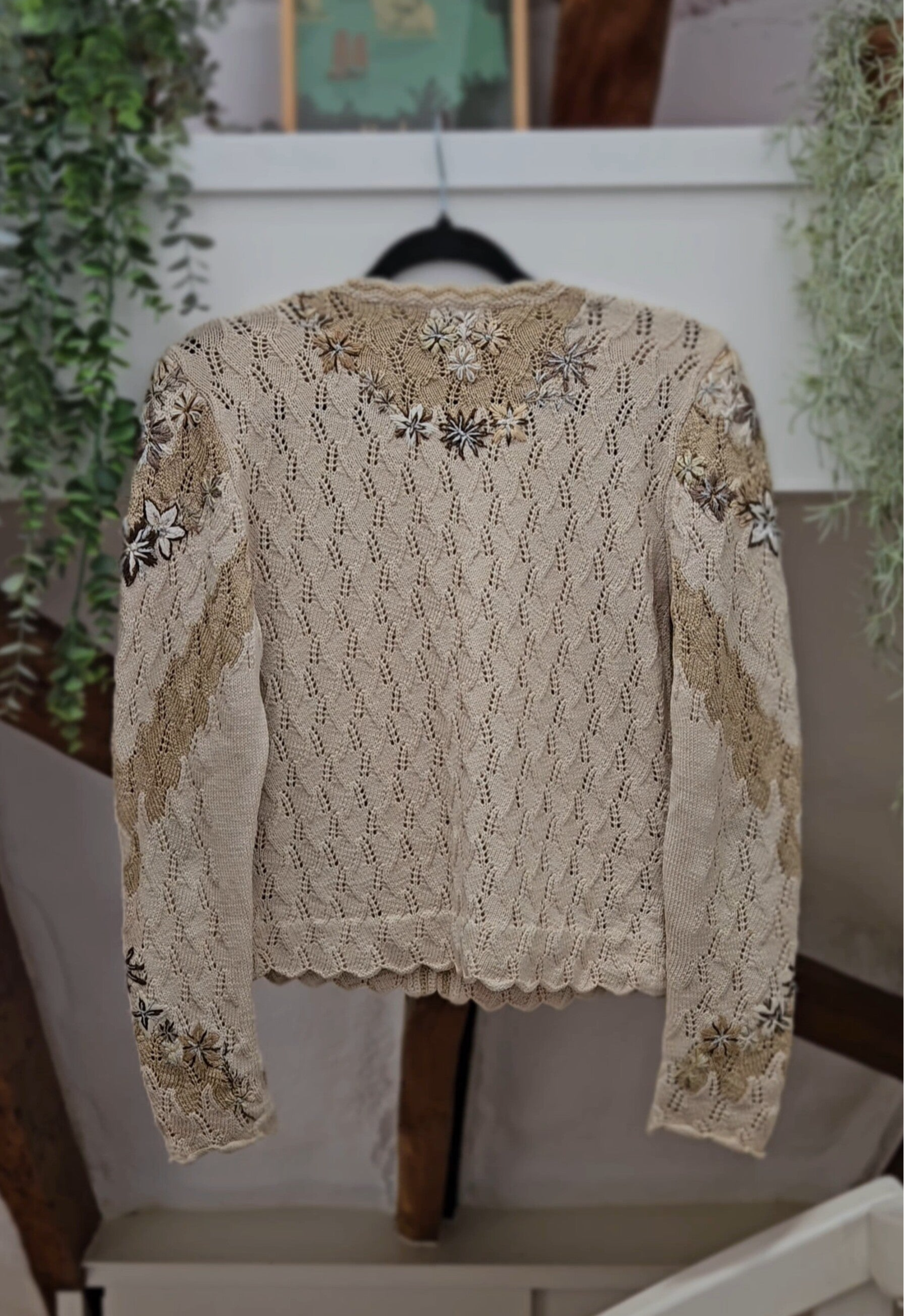 This exquisite Wolkenstricker cardigan showcases the brand’s signature craftsmanship with intricate hand-embroidery and delicate floral detailing. Made from fine cotton in soft neutral tones, it features elegant buttons with the signature W logo. A timeless Bavarian-inspired design. A true collector’s piece that blends tradition with feminine charm.