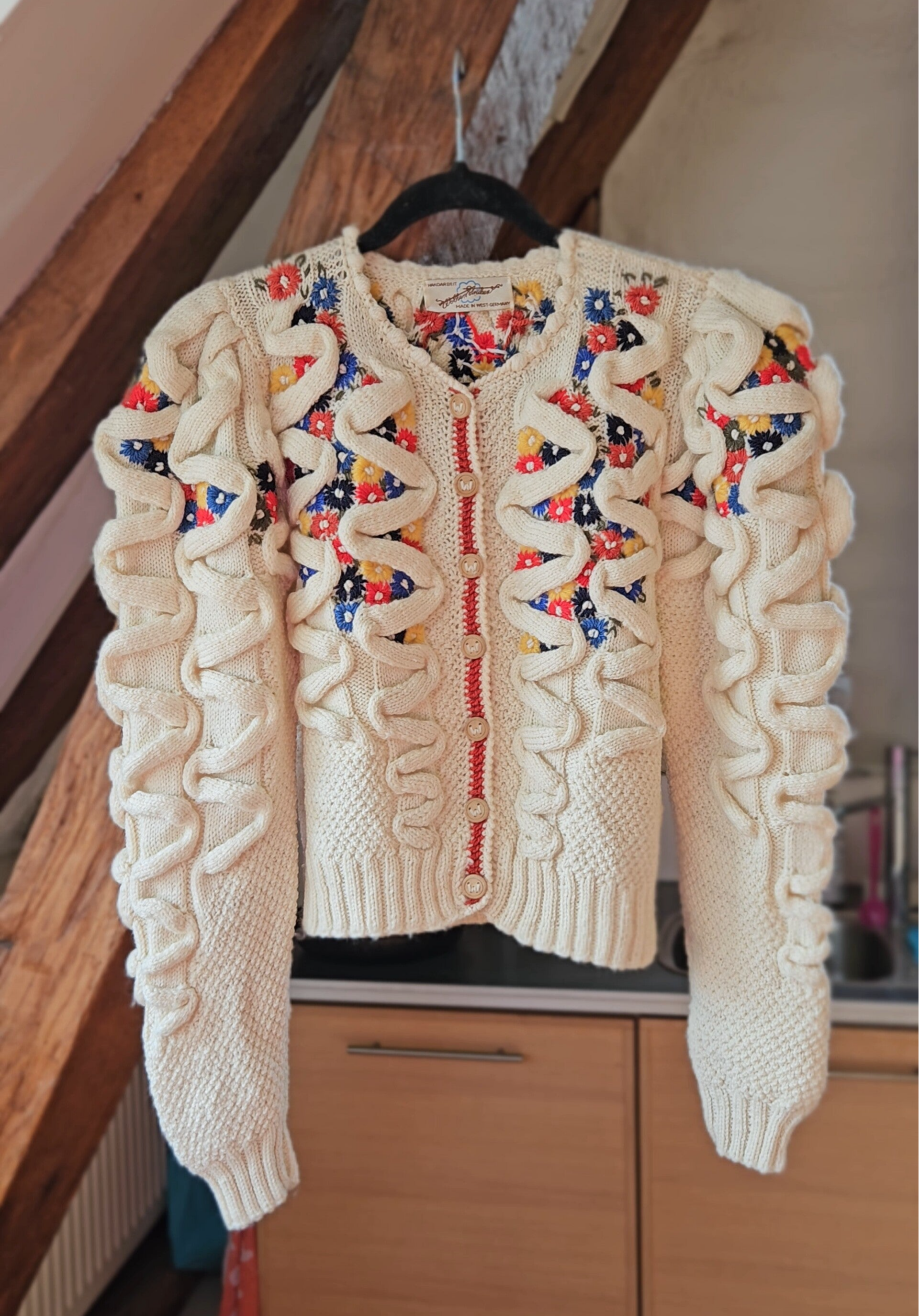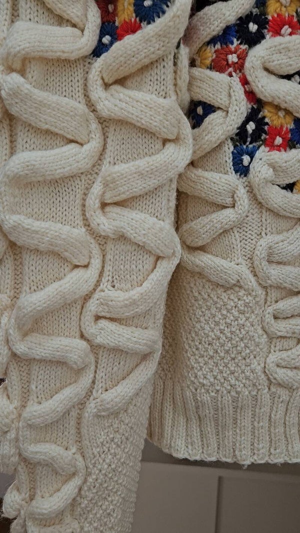 A striking 1980s Wolkenstricker cardigan, handcrafted in West-Germany with the label’s signature attention to detail. This cream wool knit features bold oversized cable accents, puff shoulders & vibrant hand-embroidered floral motifs in red, blue, yellow, and black, and the traditional button closures with the signature W. A rare statement piece that perfectly captures vintage Alpine charm with an artistic twist.