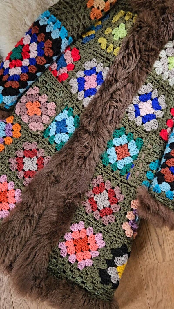 A stunning vintage coat crafted from soft suede and genuine sheepskin, beautifully combined with colorful hand-crocheted granny squares. A true unique one of a kind statement piece!