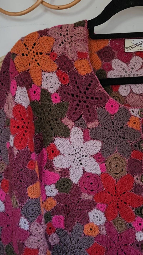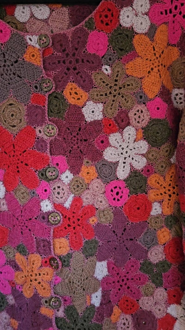 The detailed crochet patchwork consists of numerous handcrafted floral elements, artfully interwoven with a woven stitch. The harmoniously coordinated shades of pink, red, purple & orange lend the piece a natural elegance and a touch of boho romance.