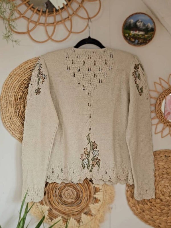 Elegant vintage cardigan by Wolkenstricker, beautifully hand-embroidered with floral motifs in soft pastel tones. Crafted from fine cotton in a delicate cream shade, featuring intricate lace-like knit details and traditional metal buttons with the signature W.