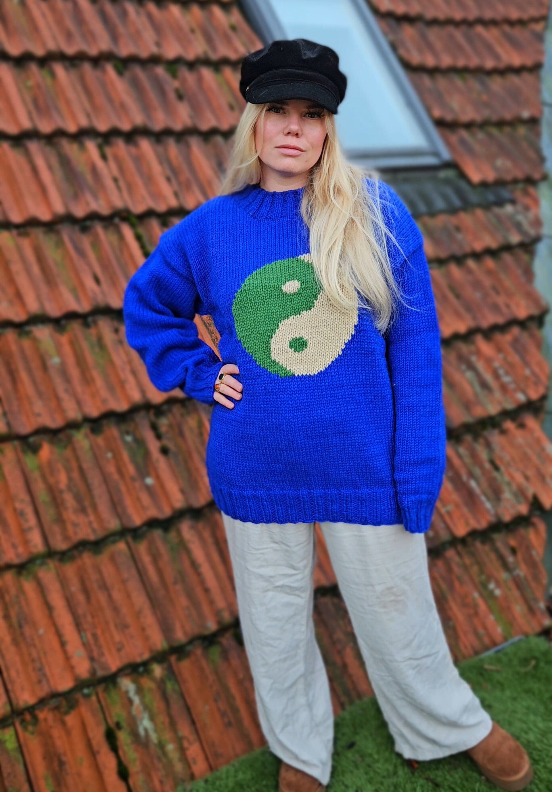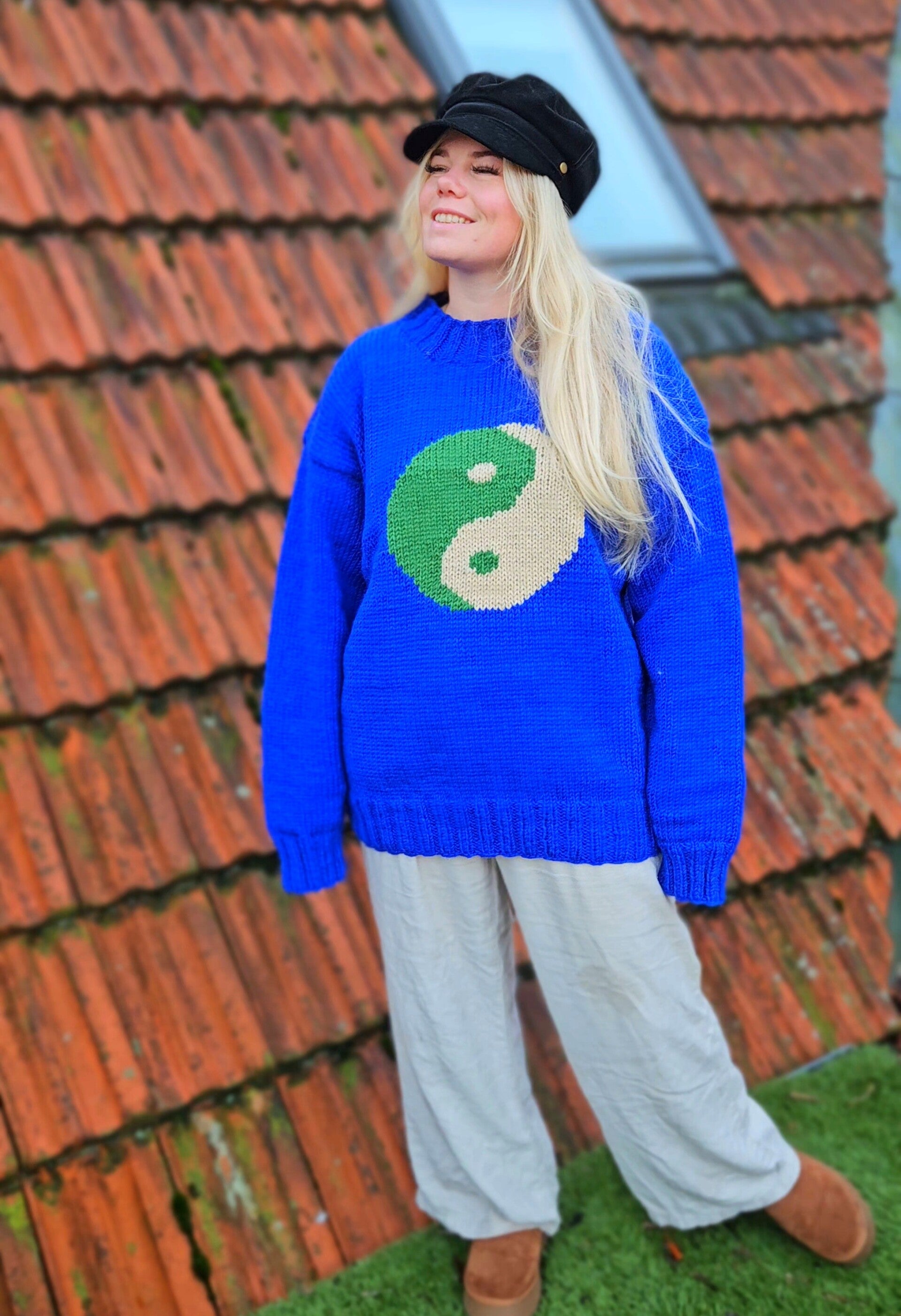 Feel the warm hug of sustainability in this chunky hand knitted Ying Yang motif jumper. The universally recognised symbol sits front and centre on the main body of royal blue yarn. A cheerful design 🪬.