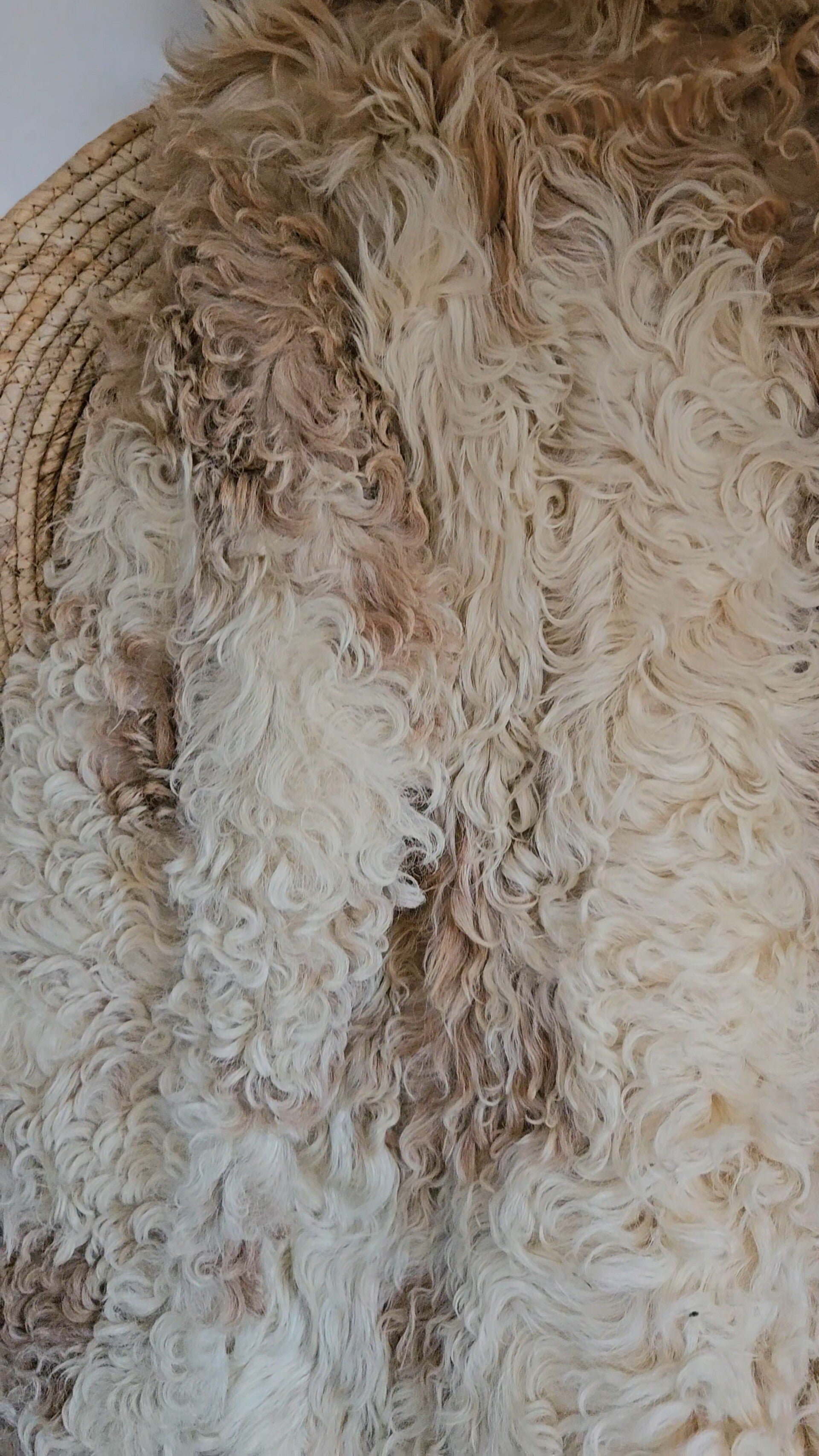 Material: outside is 100% curly fluffy sheepskin, inside is lined with smooth fabric